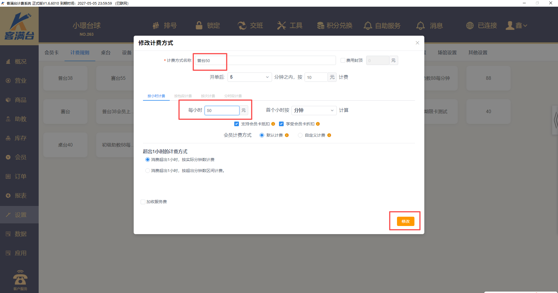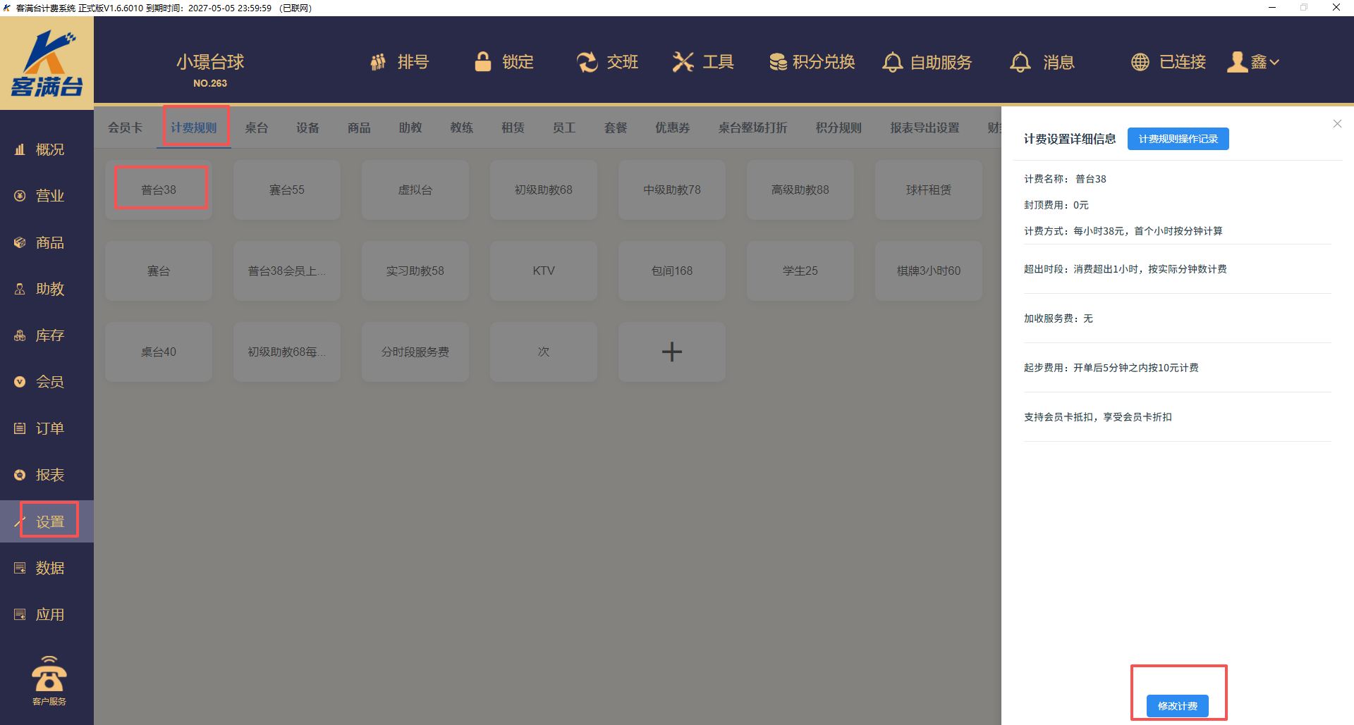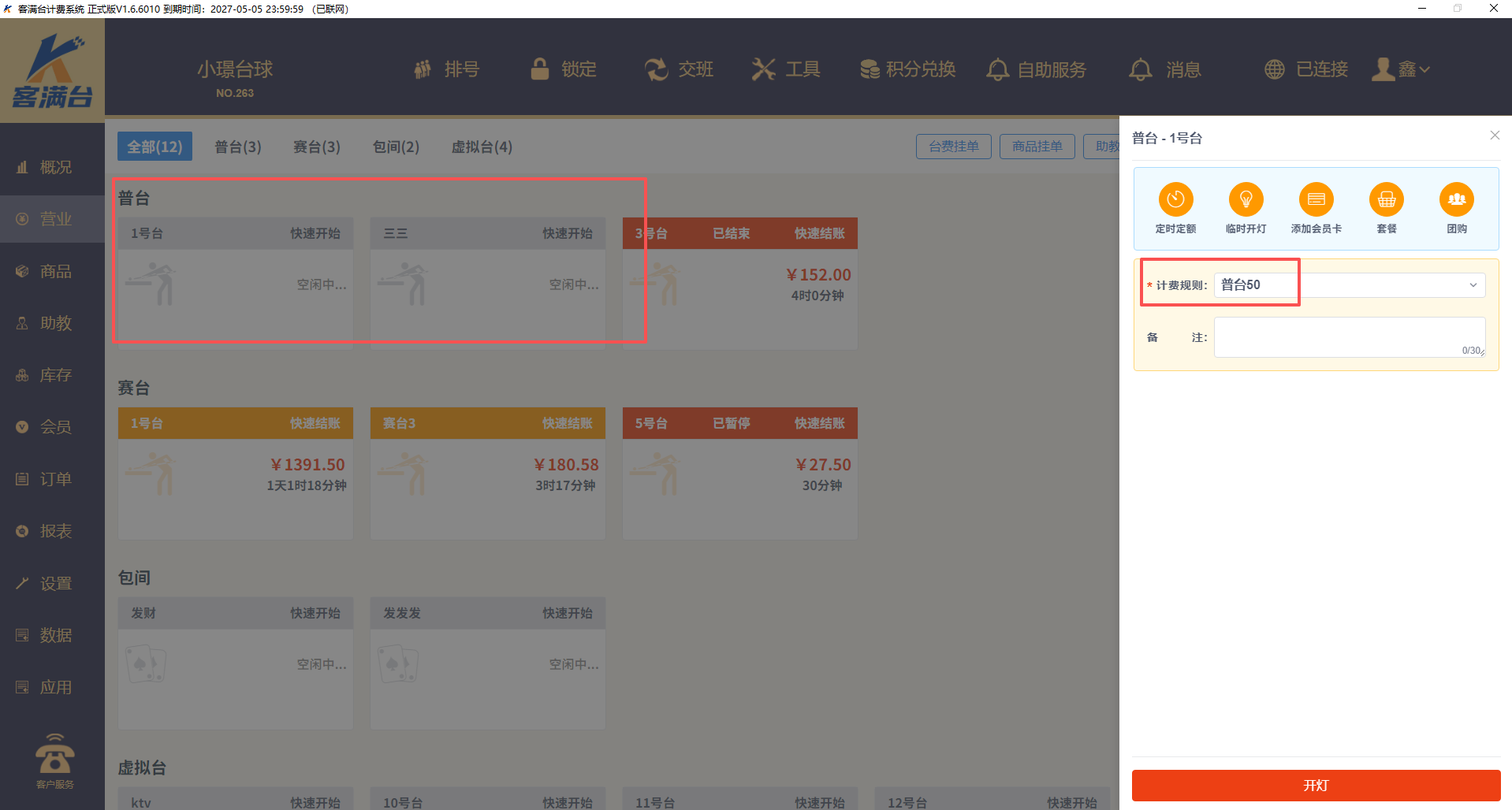 4、营业界面,再次点击桌台,计费规则已经修改完成(注意,只有新开台时有效,正在计费的还是按照之前的计费规则走)