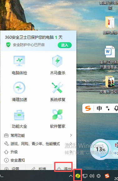 1、鼠标右键点击电脑右下角360图标,点击退出(有时候没有可以再隐藏里看到)