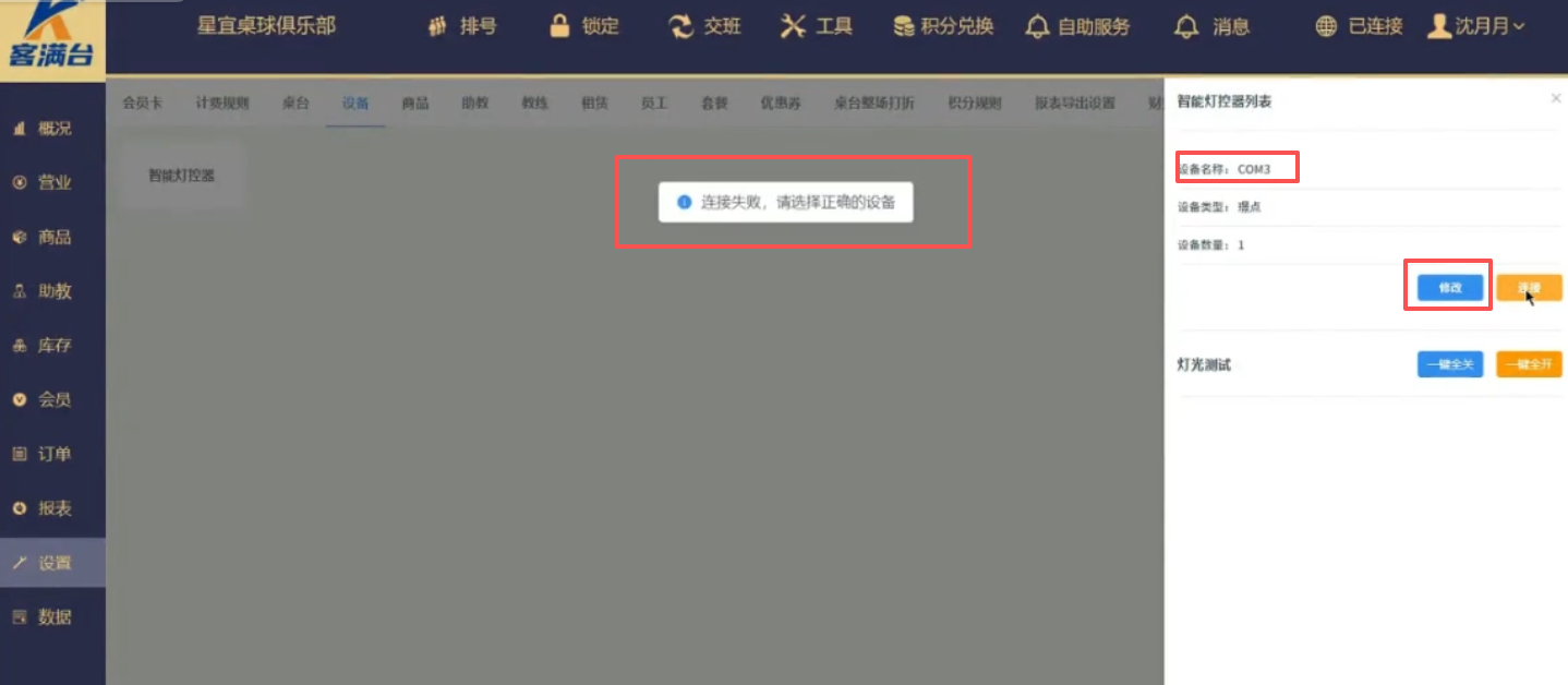如果重新插拔之后连接提示请选择正确的设备,点击修改,修改设备名称,不选择com1,选择另外一个,保存后再次连接,连接成功即可