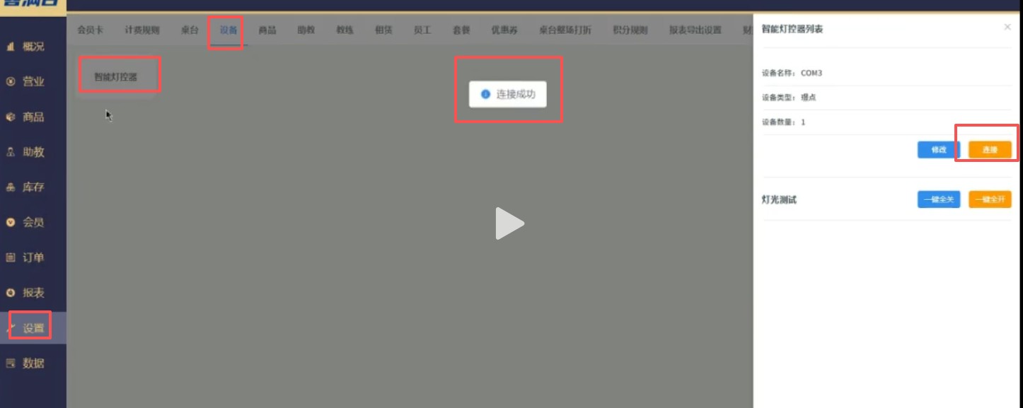 2、设置,设备,智能灯控器,点击连接,提示连接成功即可