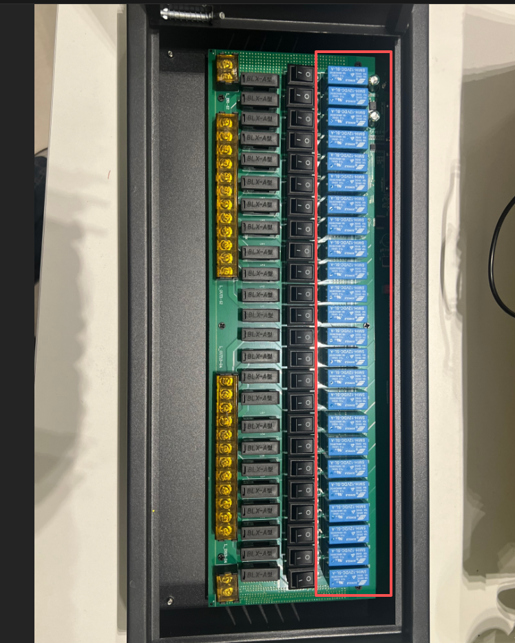 3、找到对应的无影灯继电器,8和24路是蓝色小方块,16路是黑色小方块,用螺丝刀刀把,用力敲一下,就关闭了(操作这一步时手动关闭,电脑关台时操作,一定要找到对应的继电器)