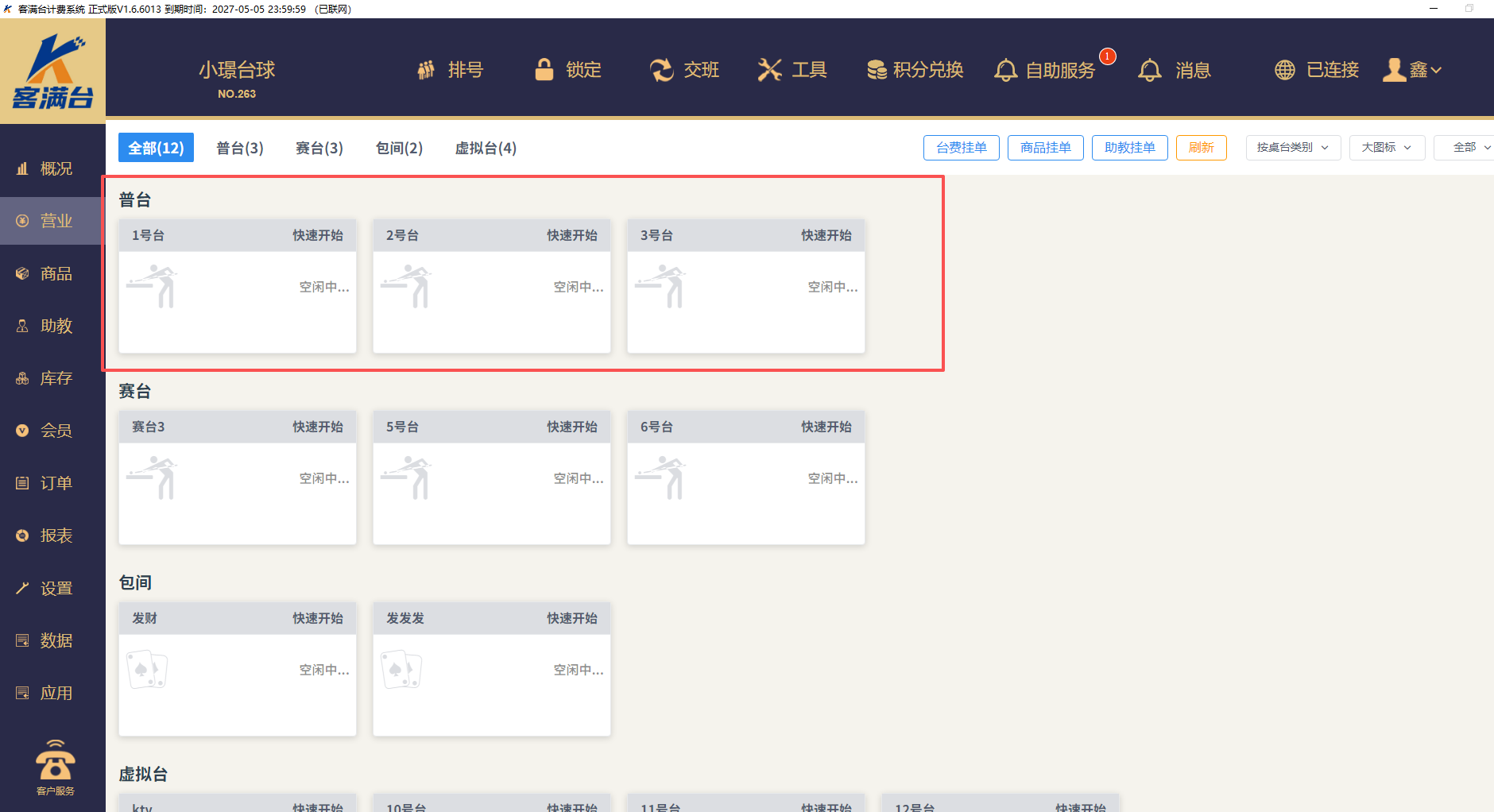 4、最后我们看营业界面已经调整好,计费不一样,桌台类型不一样