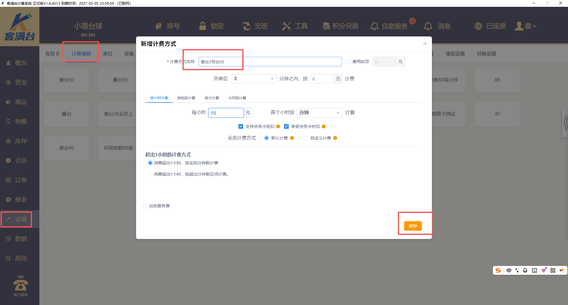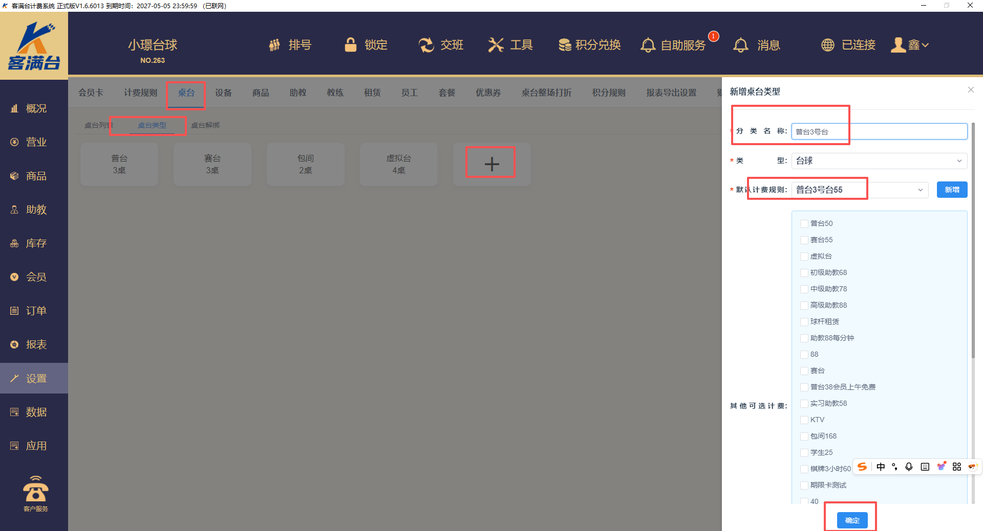 2、设置,桌台,桌台类型,新增个桌台类型,设置3号台桌台类型,默认计费规则为刚才设置好的,点击确定进行保存