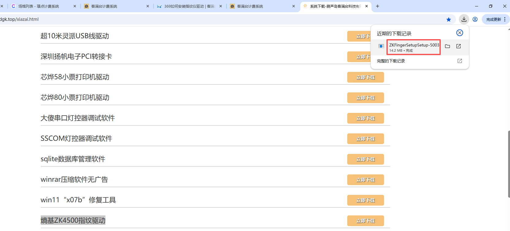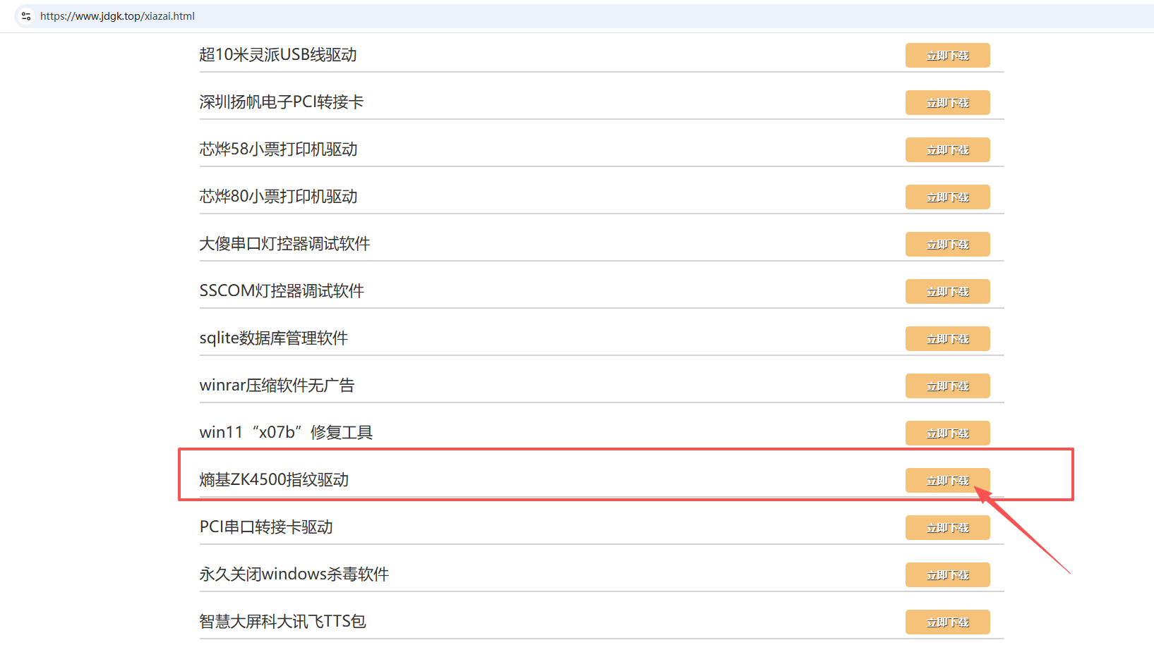 1、打开电脑浏览器,输入网址:https://www.jdgk.top/xiazai.html,下载中心,往下滑,找到熵基ZK4500指纹驱动,点击立即下载