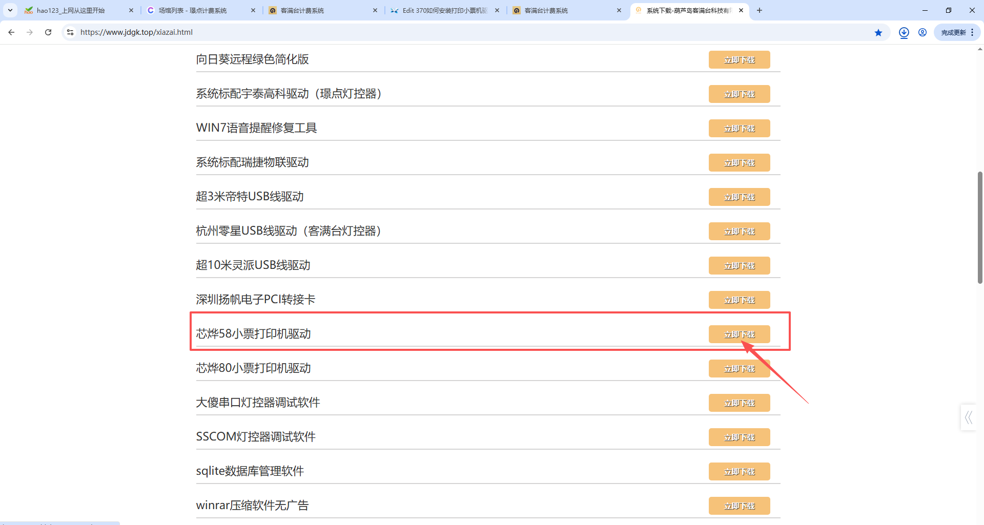 1、电脑浏览器上输入网址:https://www.jdgk.top/xiazai.html,进入到下载中心界面,往下滑,找打芯烨58小票打印机驱动,点击立即下载