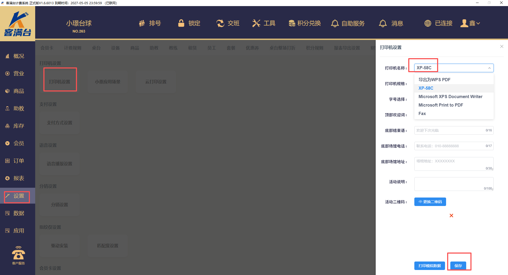 4、安装完驱动后,系统设置,其他设置,打印机设置,选择打印机名称,还可以设置介绍场馆信息词语,点击保存。