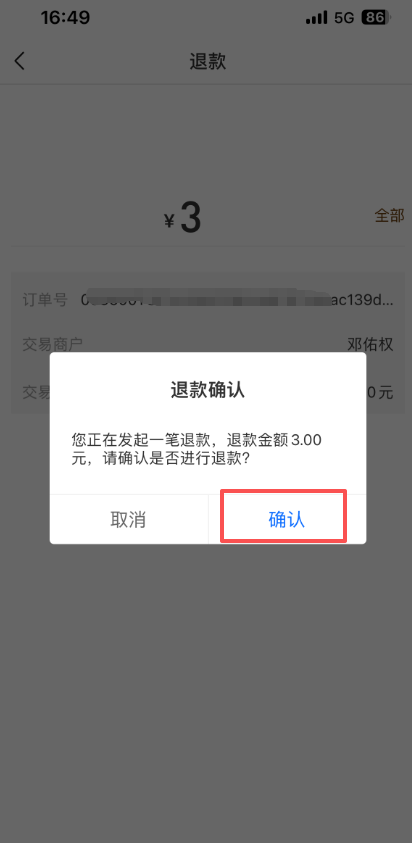4、点击确认,钱会原路退回给客户