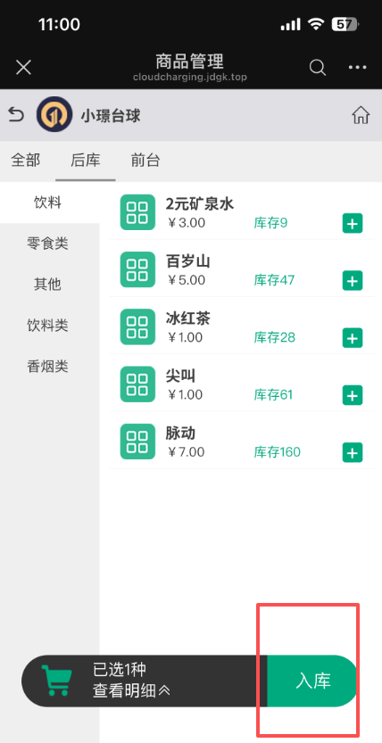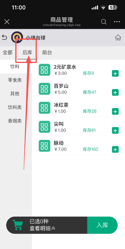 2、区域选择后库,目前只能从后库进库存