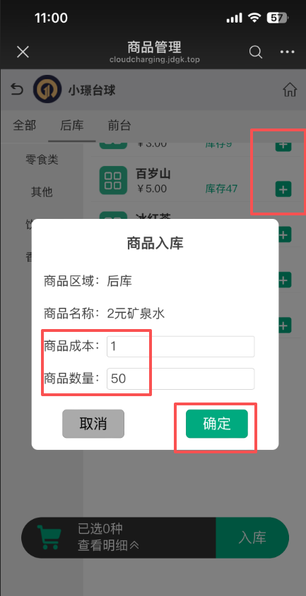 3、选择对应的商品点击+号,输入商品成本和商品数量,点击确定