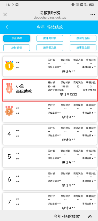 3、我们看这是关闭后的显示,其他助教信息用*表示,只能看自己当时排名和收入统计