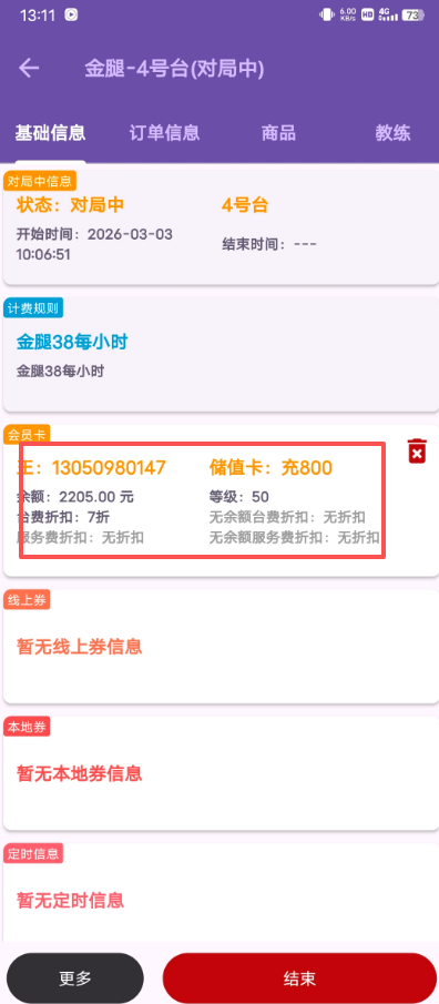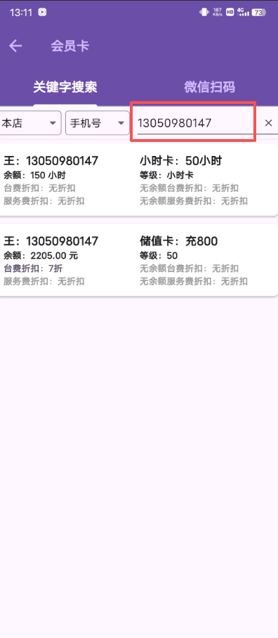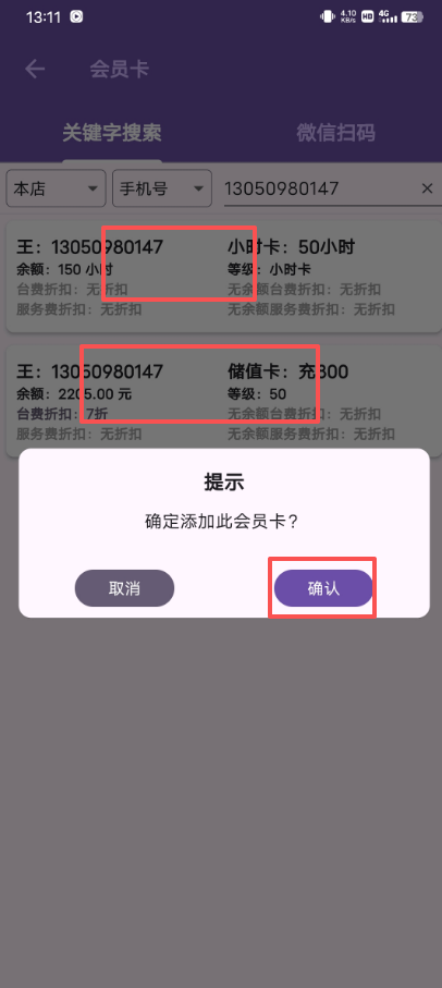 4、输入完就会显示该会员有什么卡,点击对应的卡进行挂台