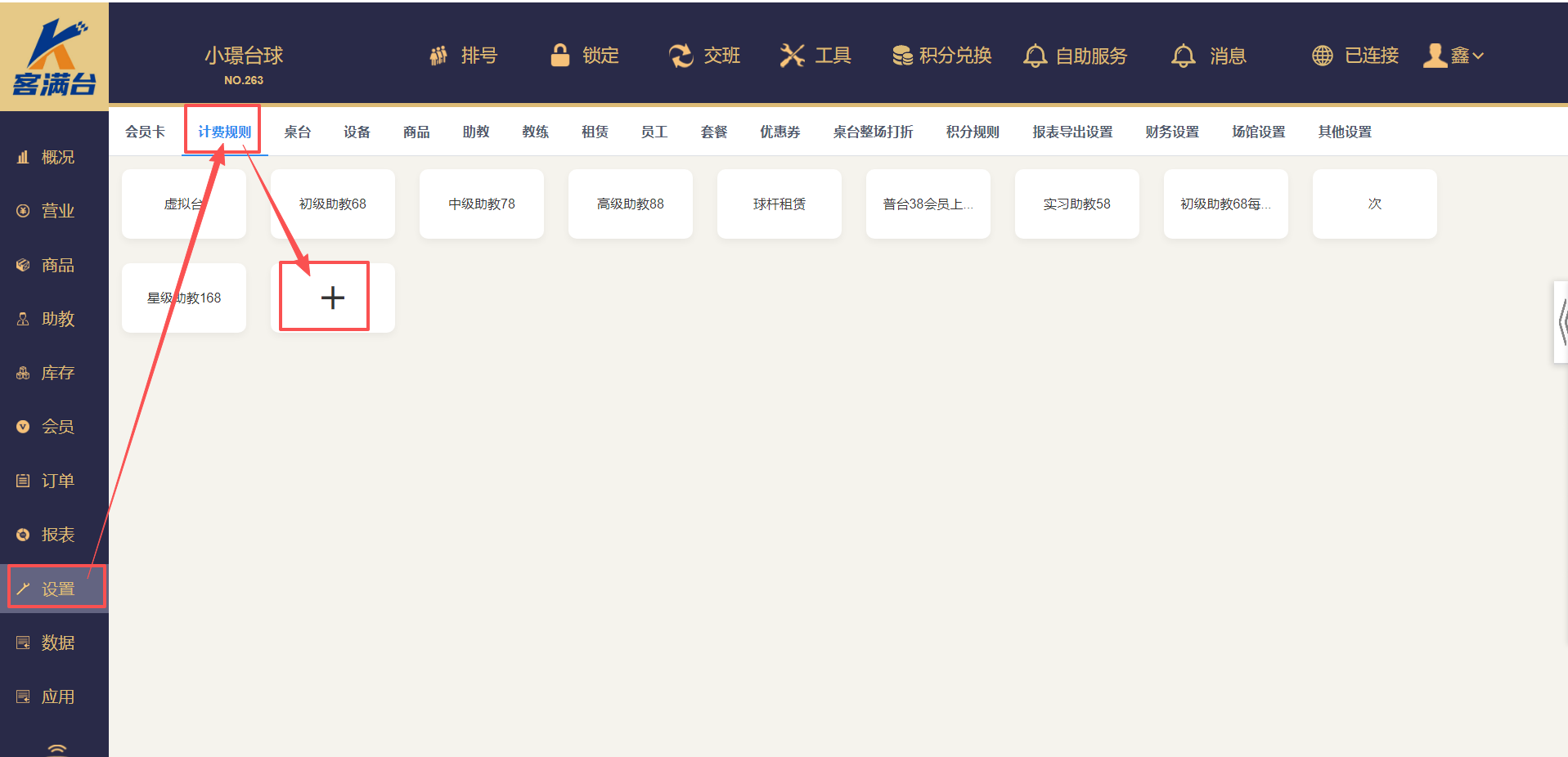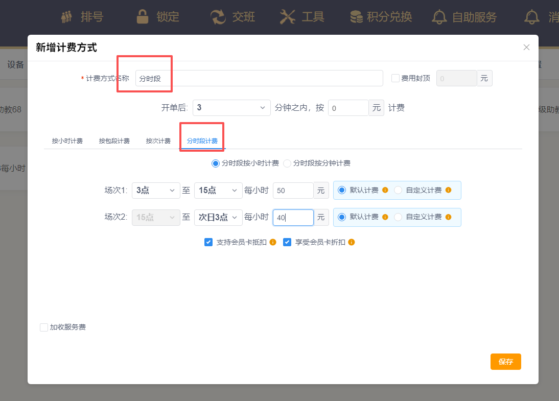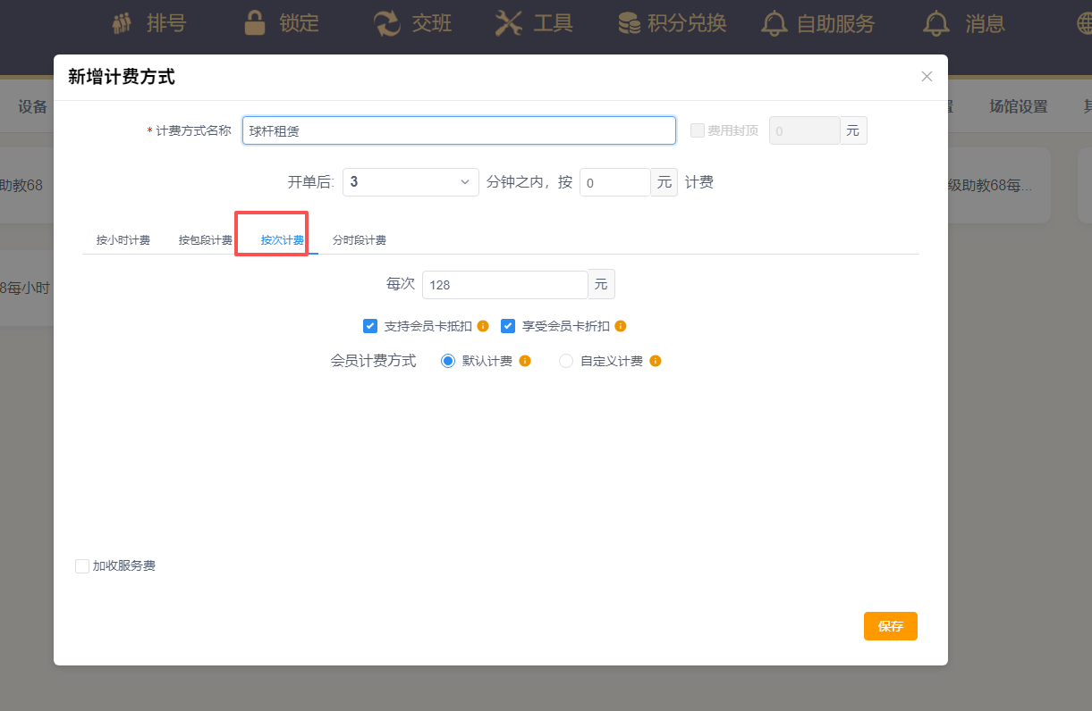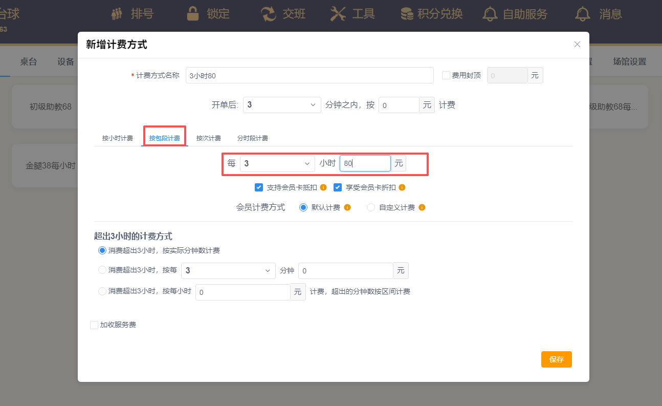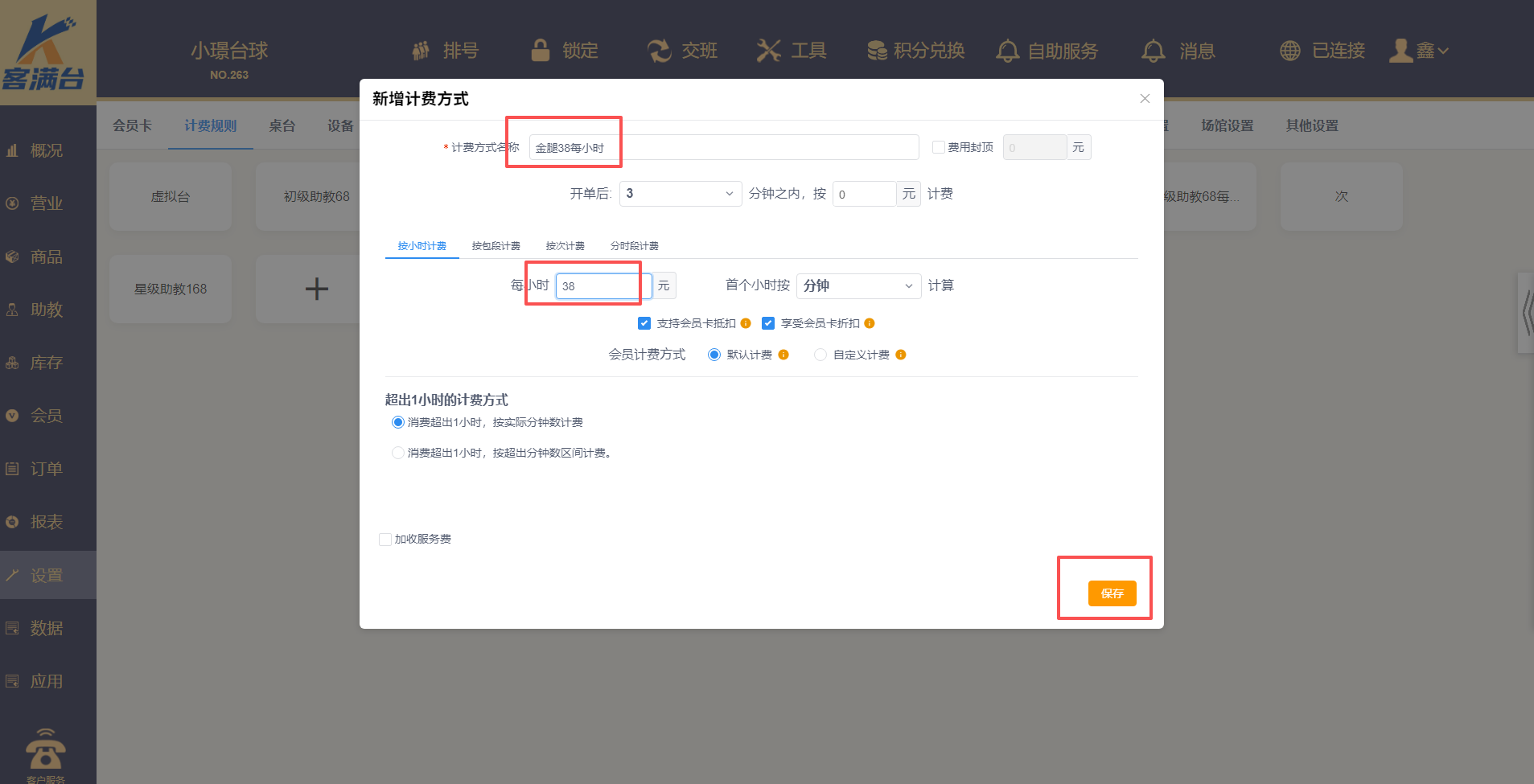 2、例如设置金腿价格,输入计费方式的名称,金腿38元,每小时设置金额38元,点击保存即可设置成功。这是按小时或者分钟来计费,系统还有包段、按次、分时段计费,给大家展示一下,根据需要设置计费。