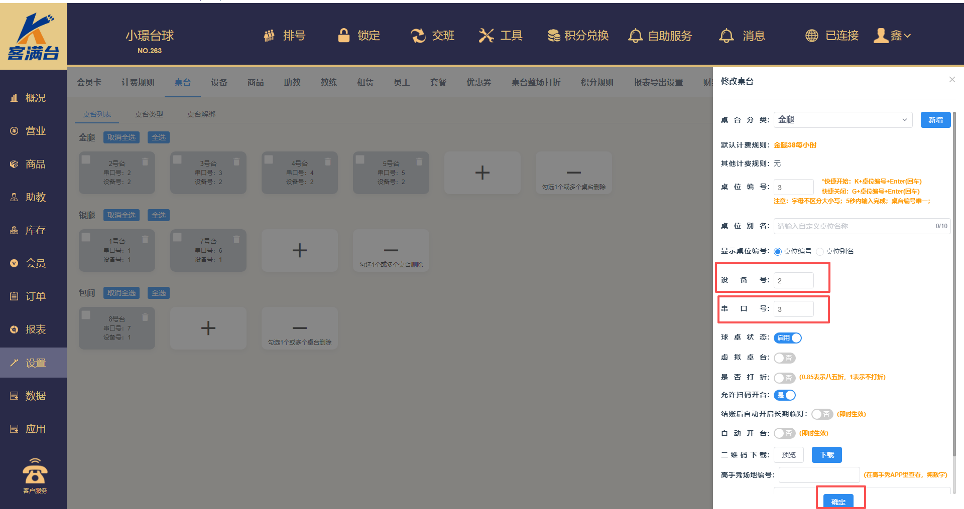 系统添加桌台时,一定要使设备号和串口号与接线的灯控对上,才可以使用系统控制开关灯