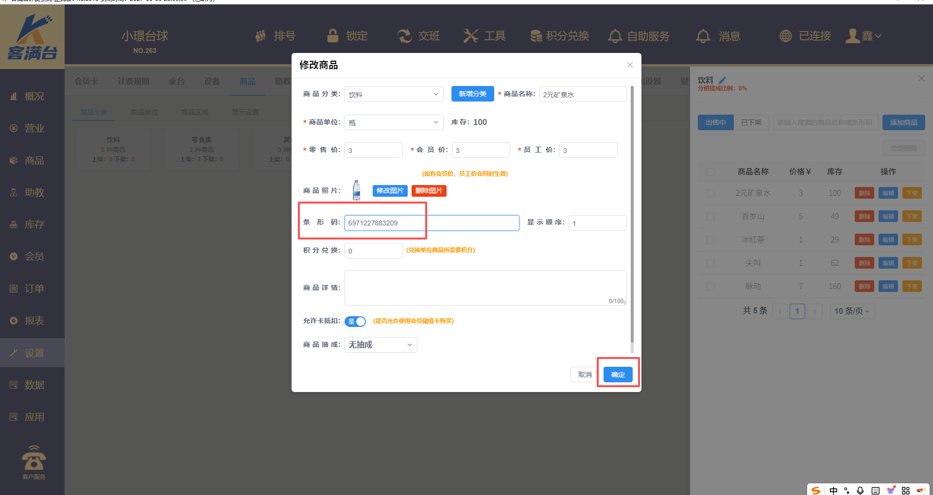 在条形码这一栏里,使用扫码枪或者扫码盒录入商品条码,点击确定进行保存