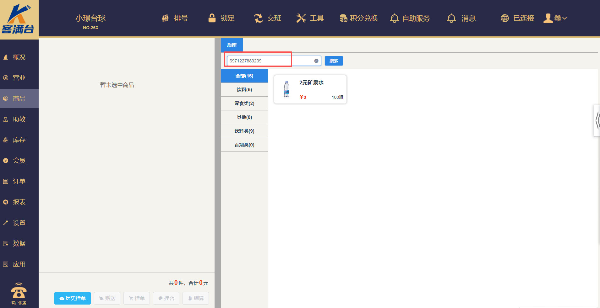 2、商品售卖界面,在这里录入条码即可快速找到商品