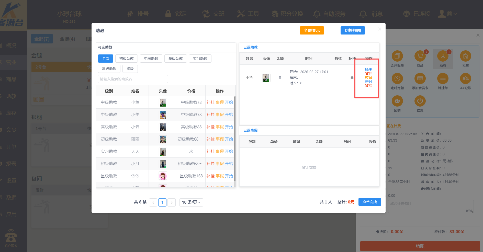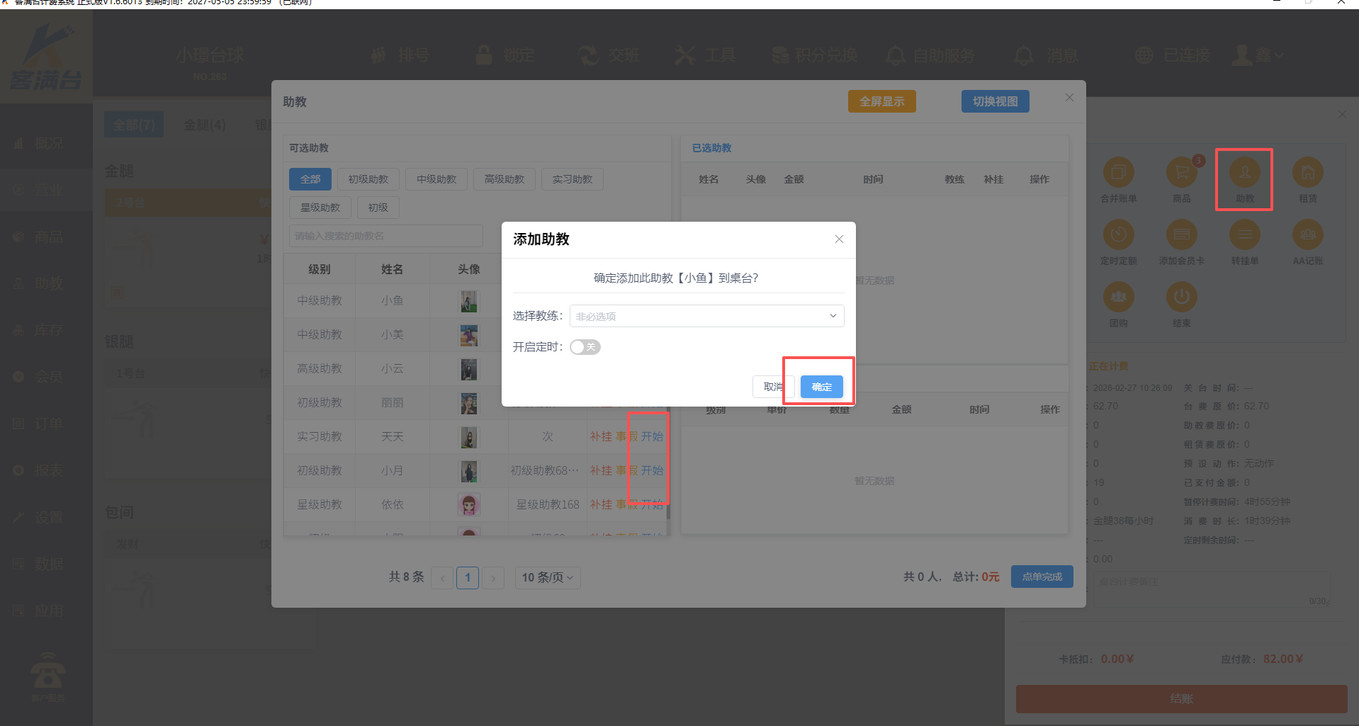 1、营业,桌台,点击助教,选择对应助教点击开始,点确定即可