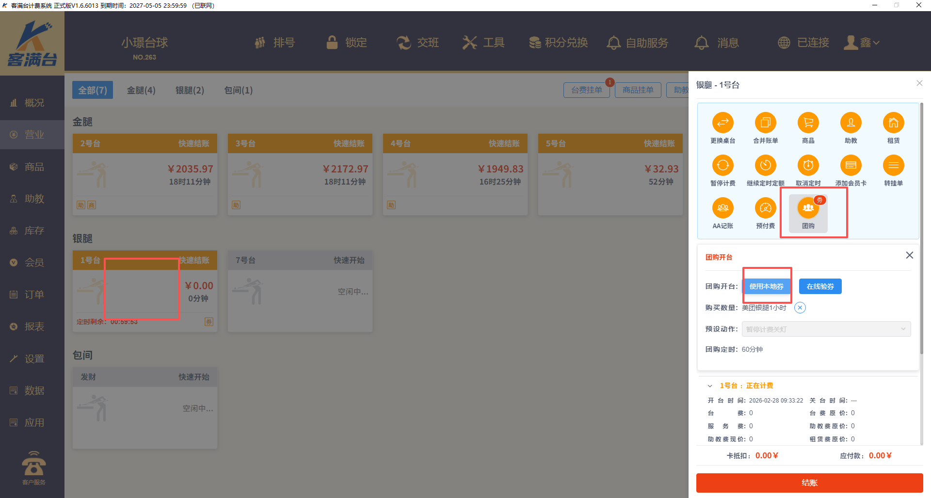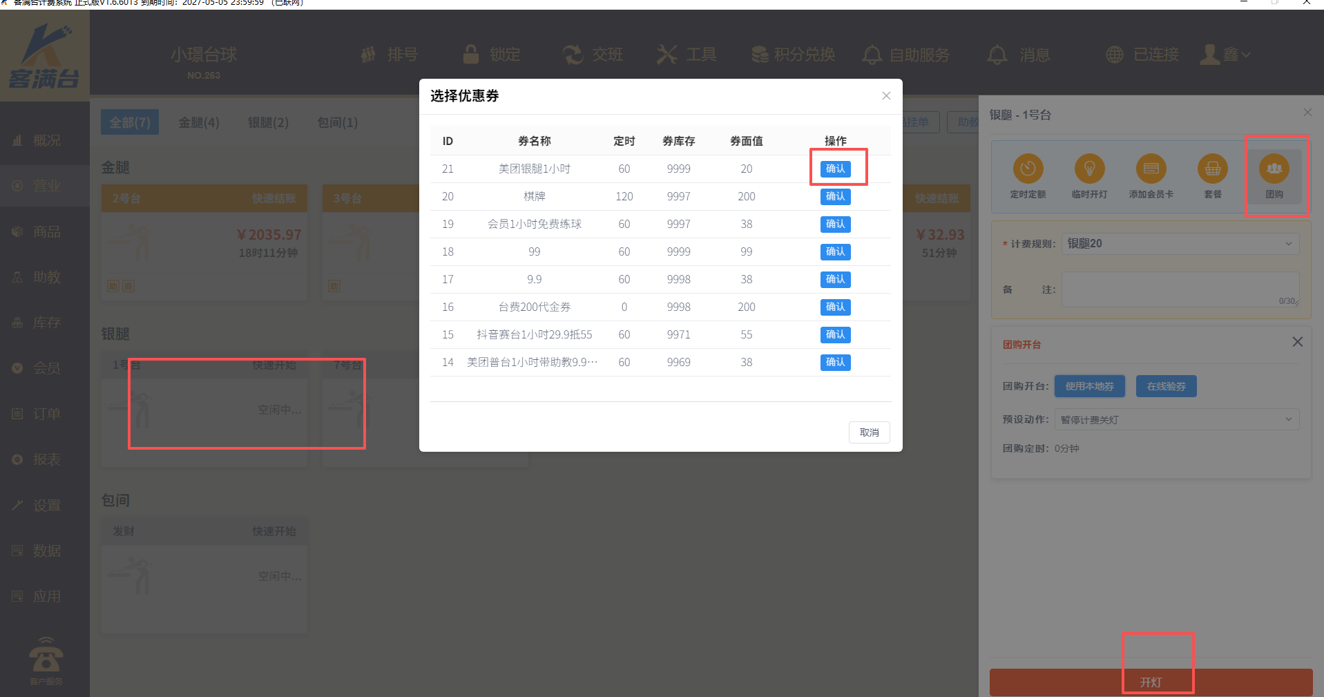 手机核销后,营业界面点团购,使用本地券,选择对应券,点击确认后,就会挂上券,点击开灯即可