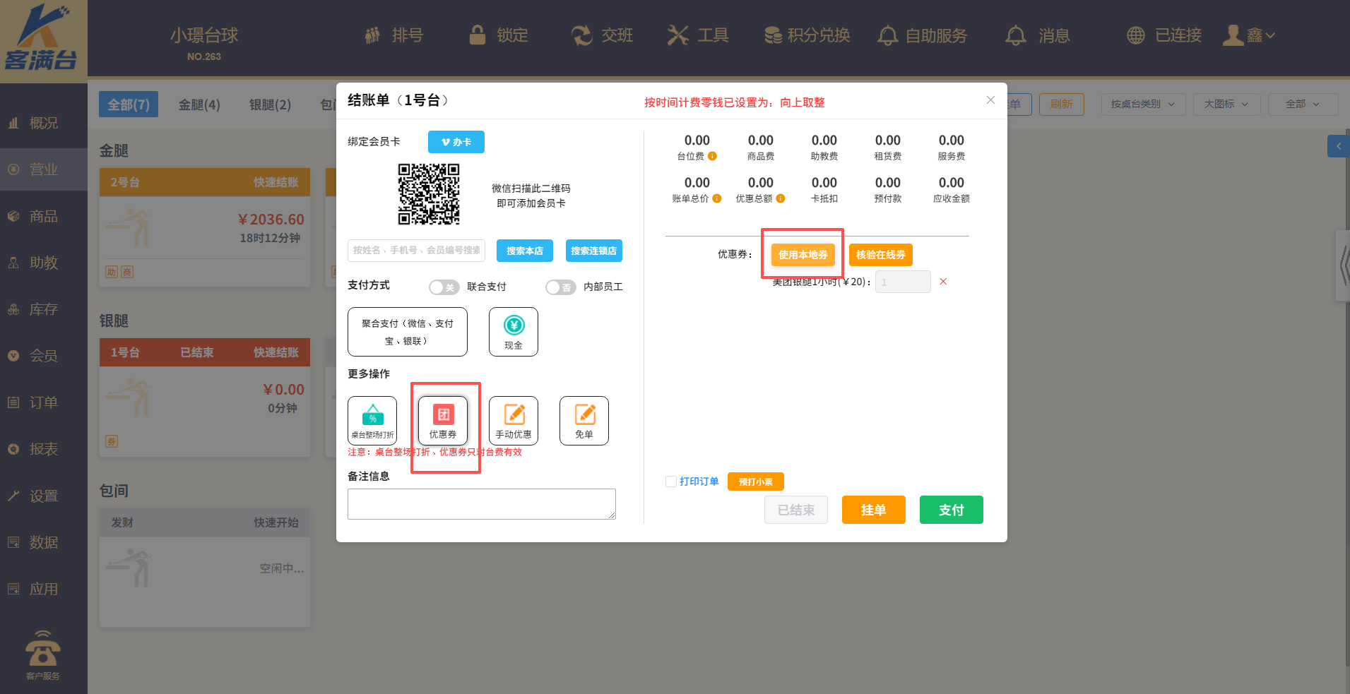 4、系统支持多节点添加团购券,开台前,中或者结账都可以,可以添加多张券,根据需要添加即可