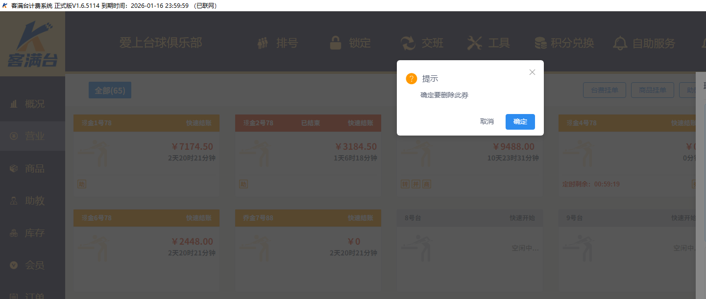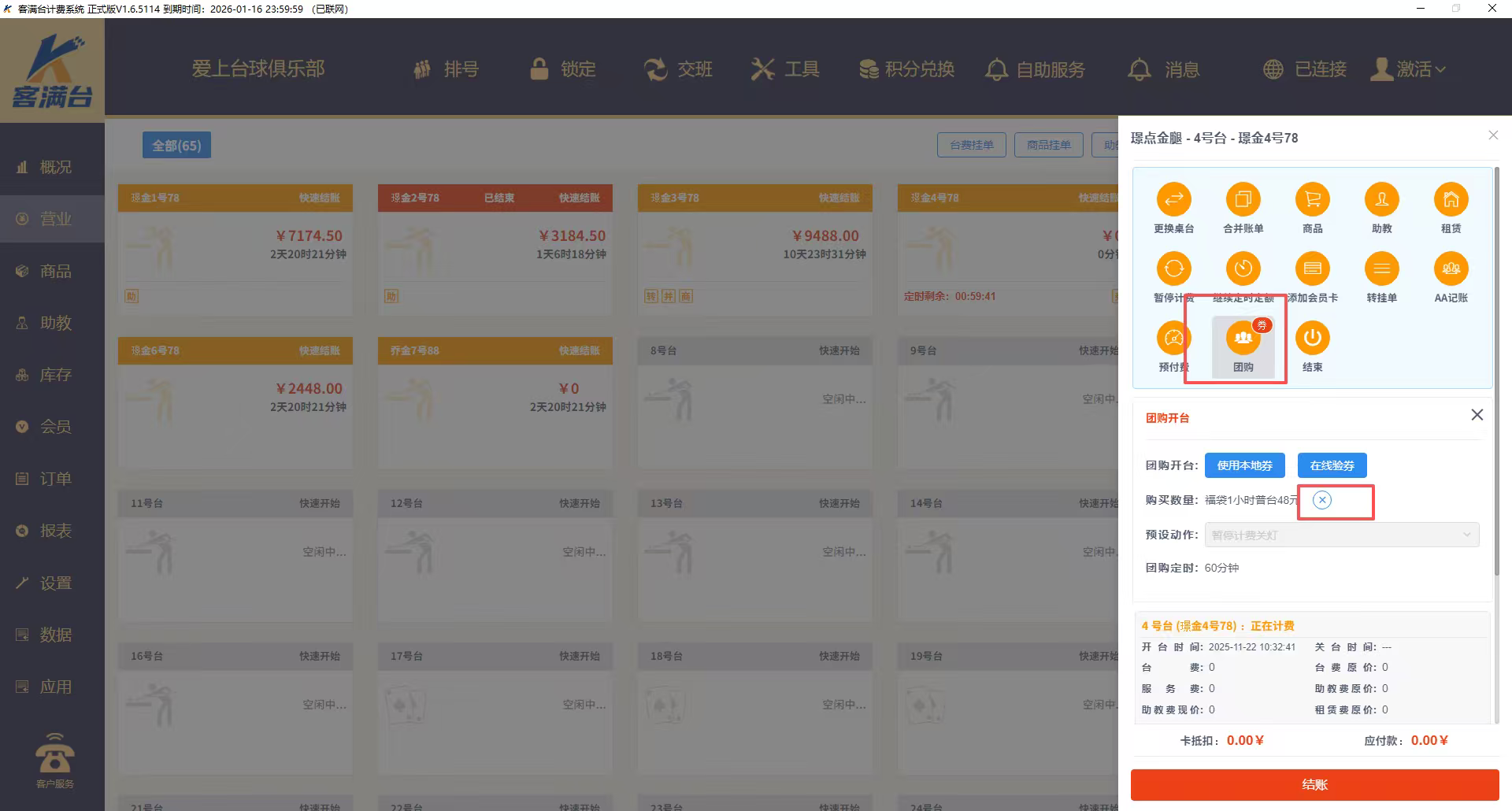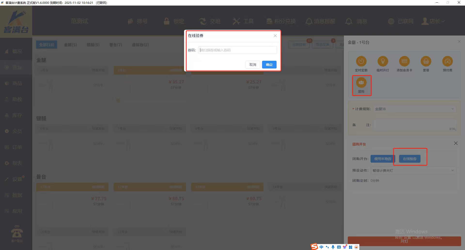 3、设置完后就可以直接使用系统核销了,营业界面点桌台,点团购,在线验券,直接使用扫码枪或者扫码盒扫券码核销即可