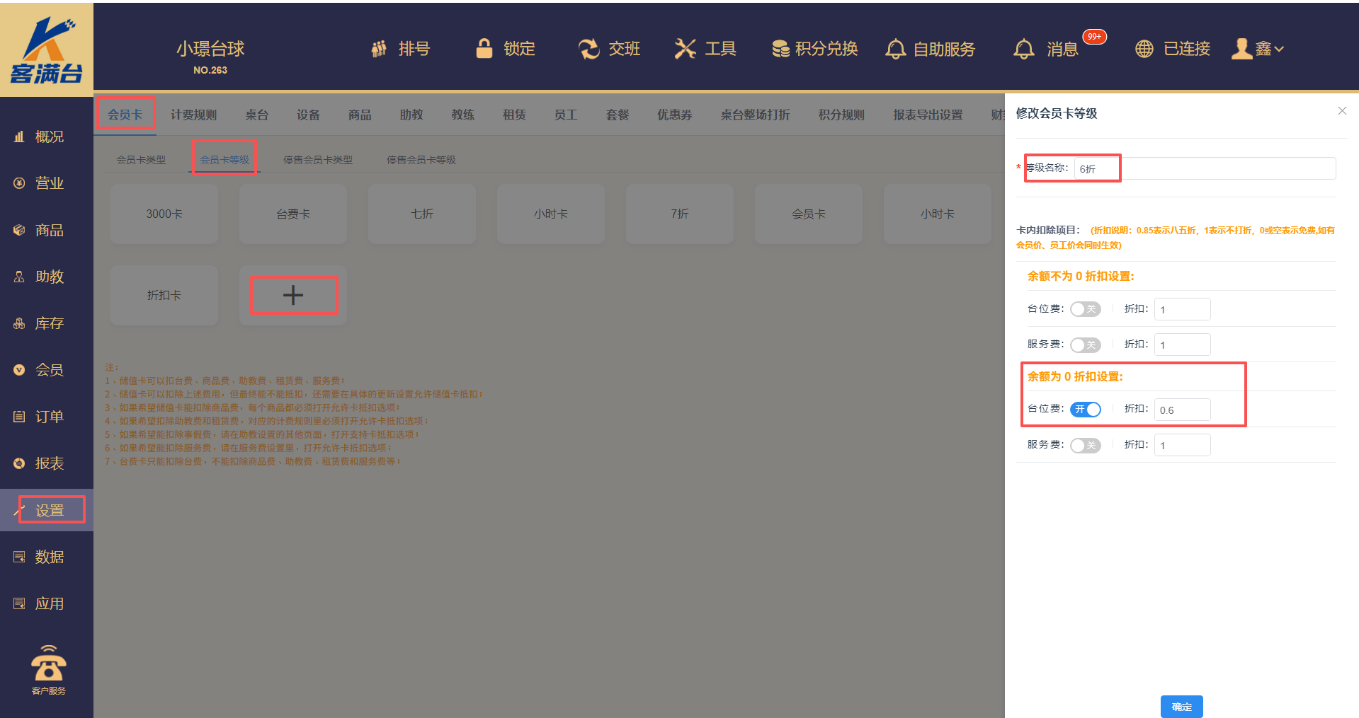 台位费打折打开,输入折扣,1为不打折,0为免费,0.6为6折(注意设置折扣卡的会员卡等级时,一定要在余额为0的折扣里设置,否则不生效)