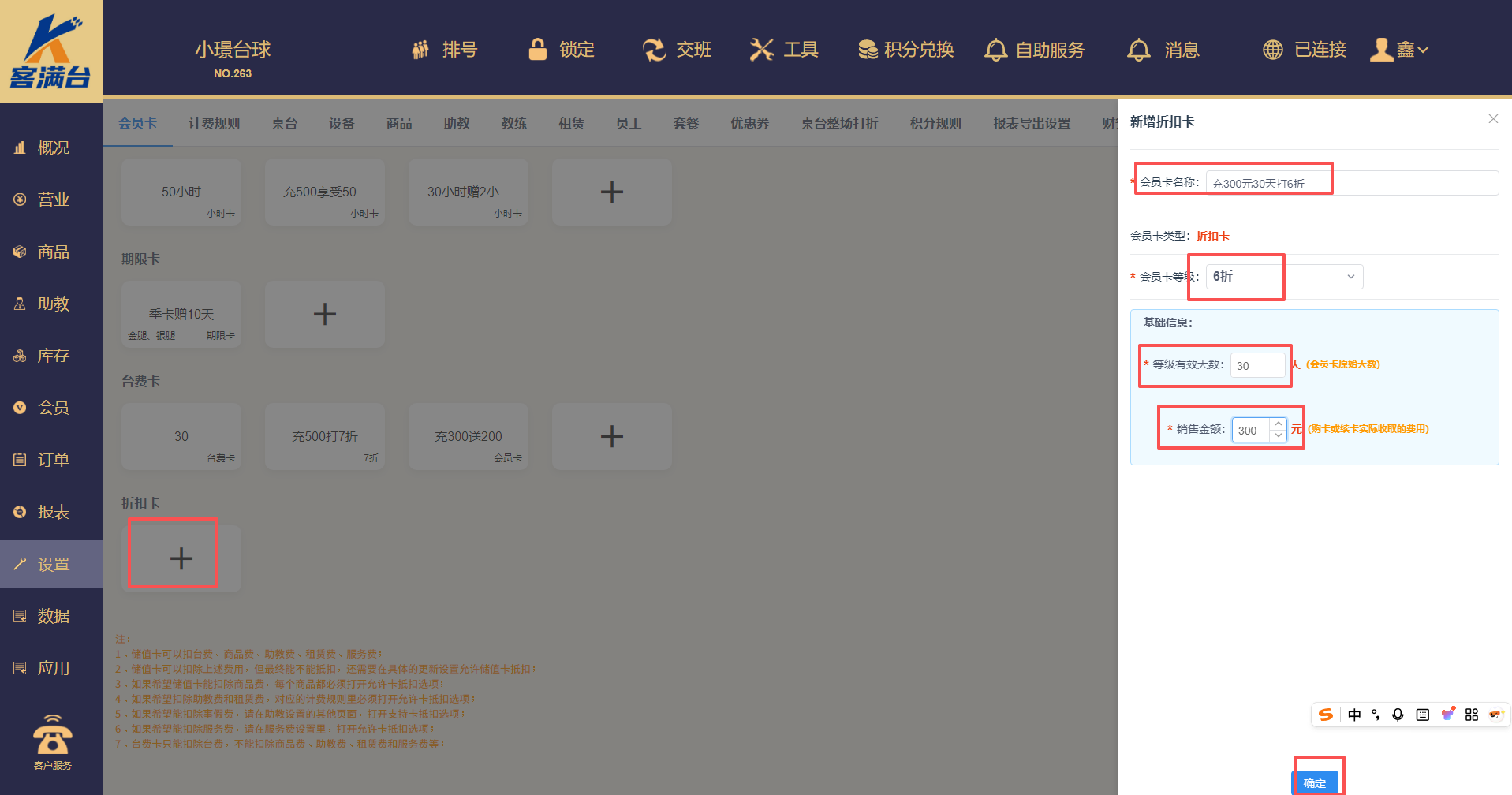 2、设置,会员卡,折扣卡,新增,需要注意的是折扣卡是在有效天数内,只要挂卡,就打折台费,卡里余额不会减少,到期后就不能使用该卡(如果想正常扣卡里余额,不设置天数,可以办储值卡或者台费卡)