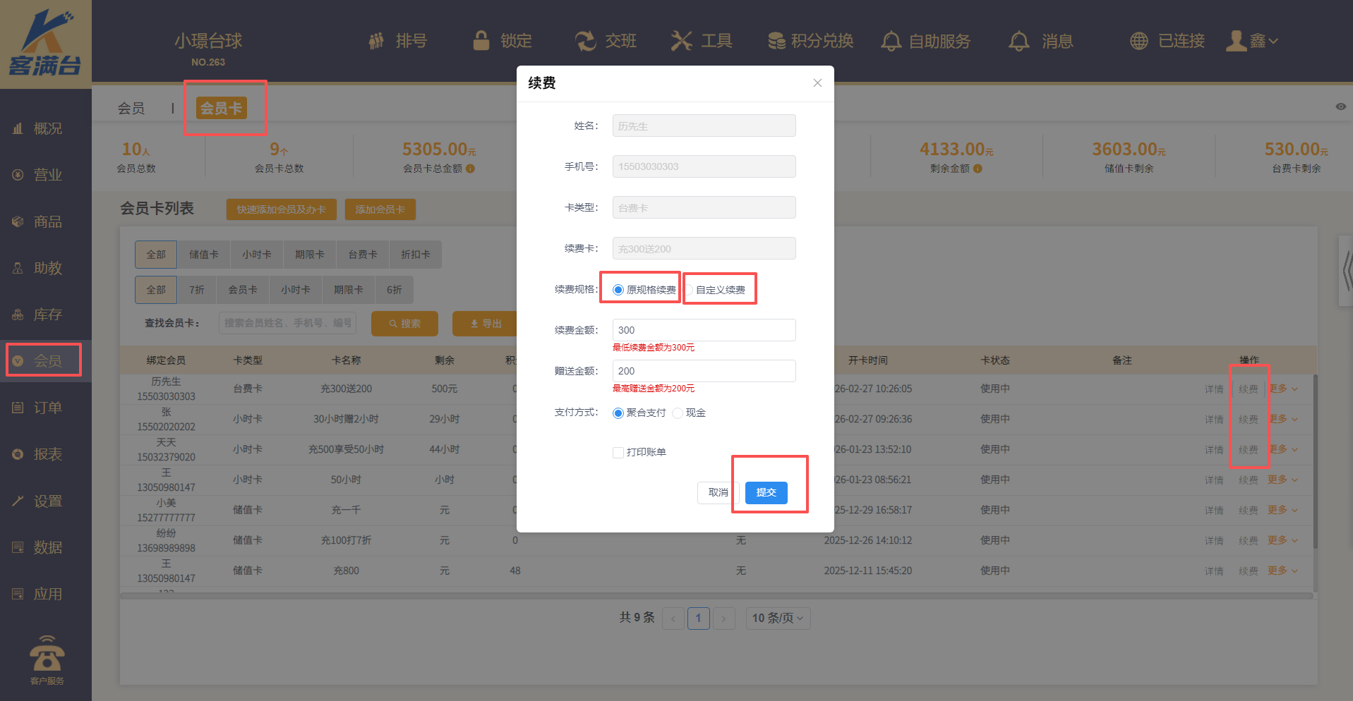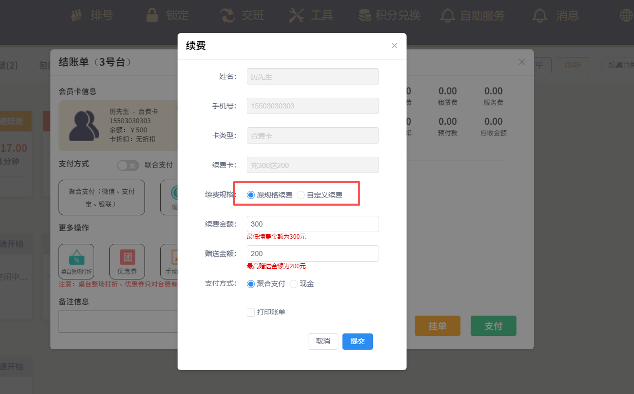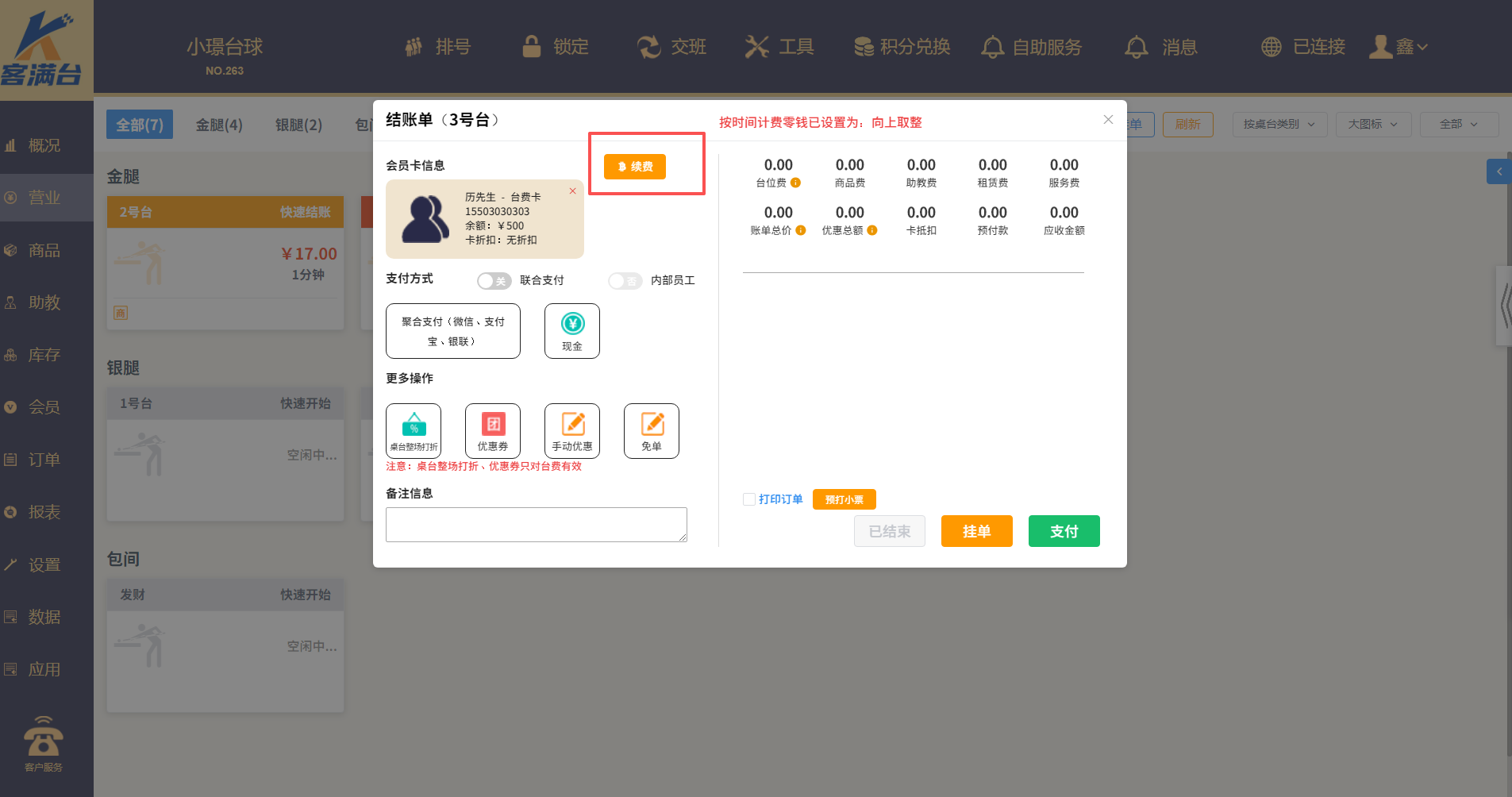 第二种:营业界面,点结账,挂卡后也可以点续费,输入金额、选择支付方式后点提交即可