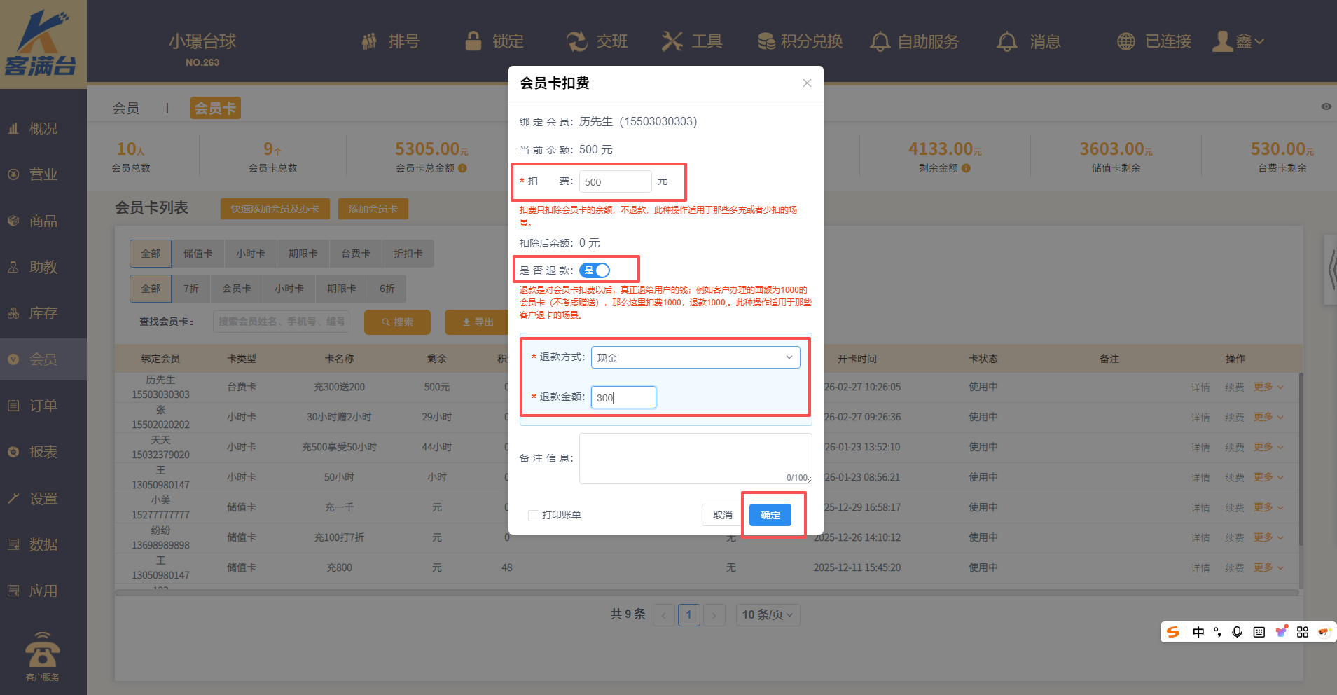 是否退款选择是,选择退款方式,输入要退给会员的金额,如果是充值赠送会员卡,那么只退本金即可,这个根据球房规定可以设置金额
