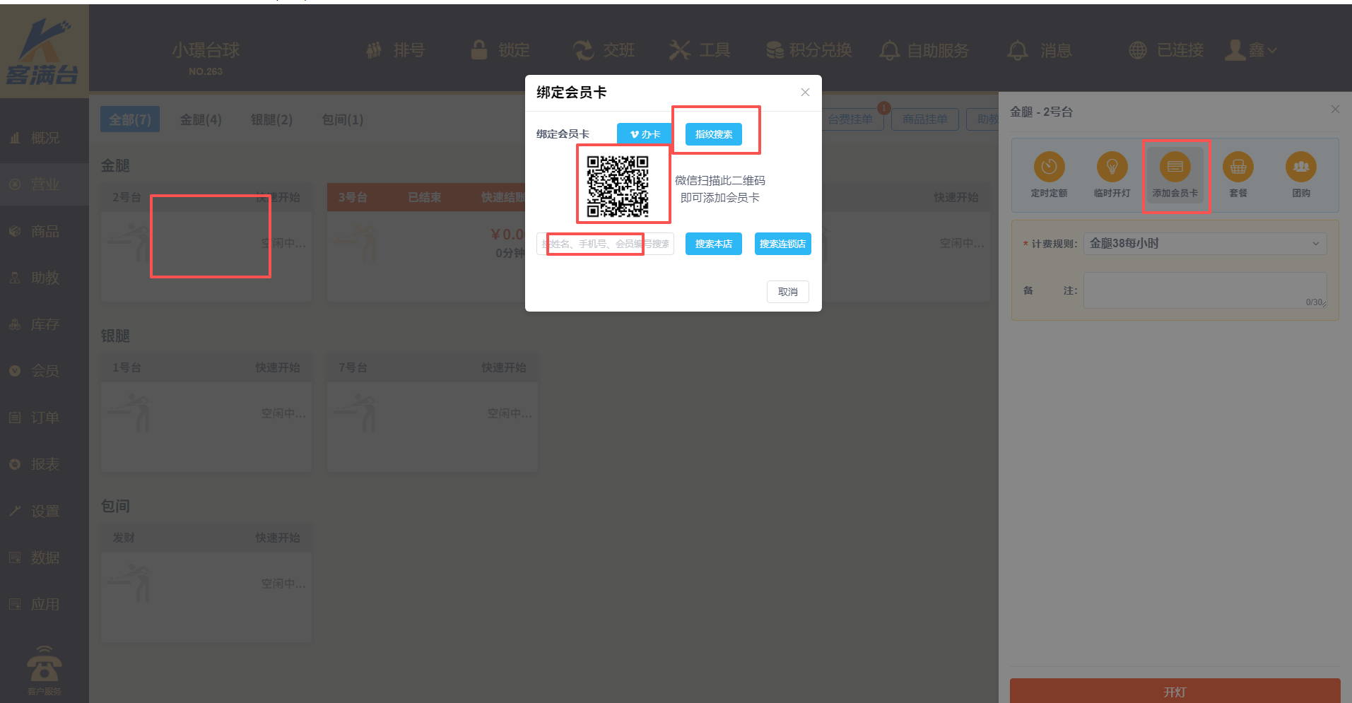 系统支持三种挂卡方式:关键词搜索、会员微信号自己扫码添加、指纹挂卡;支持开台前、中、结账时添加会员卡