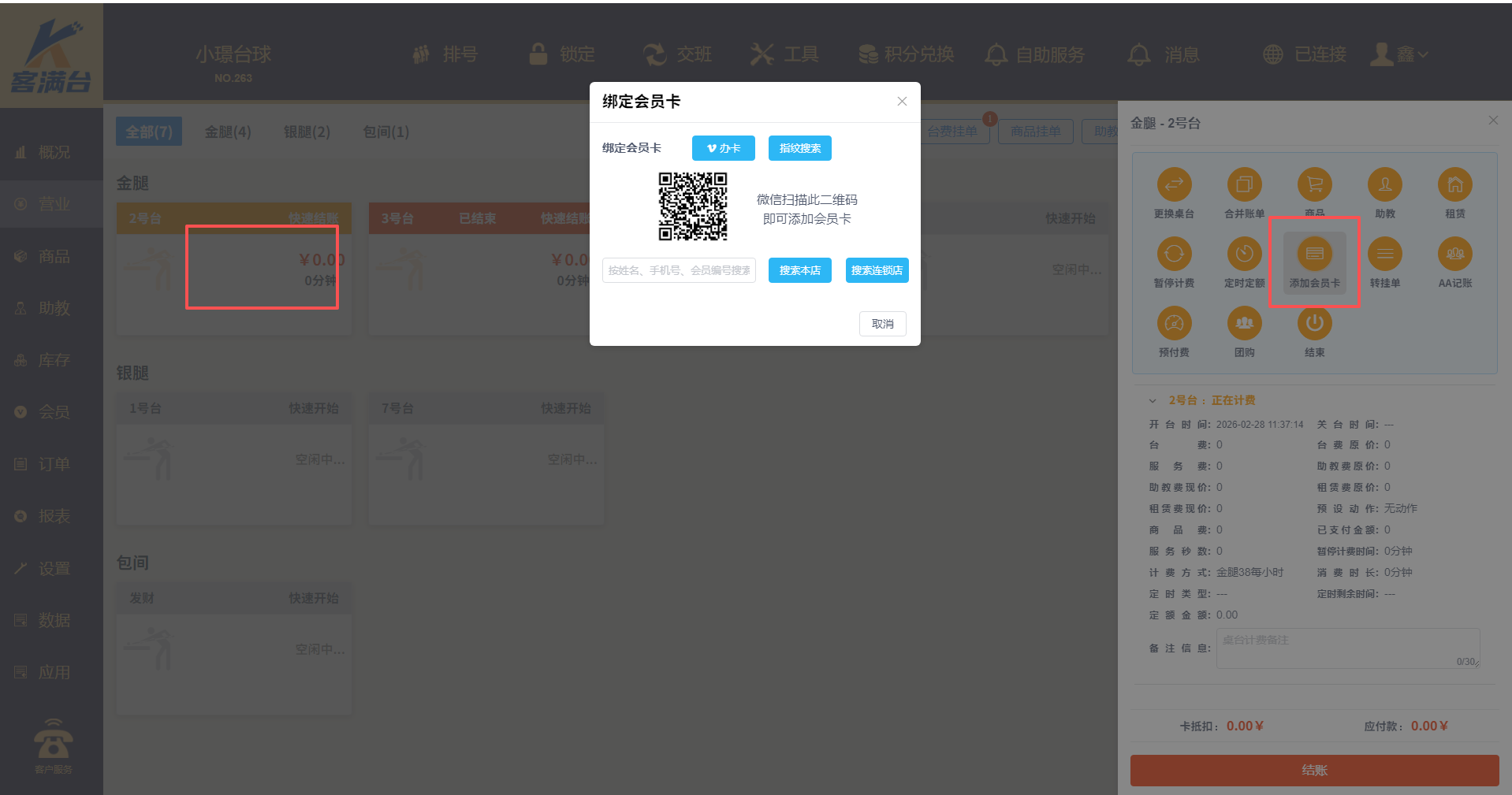 开台中添加会员卡点正在计费的桌台,点添加会员卡,挂卡即可