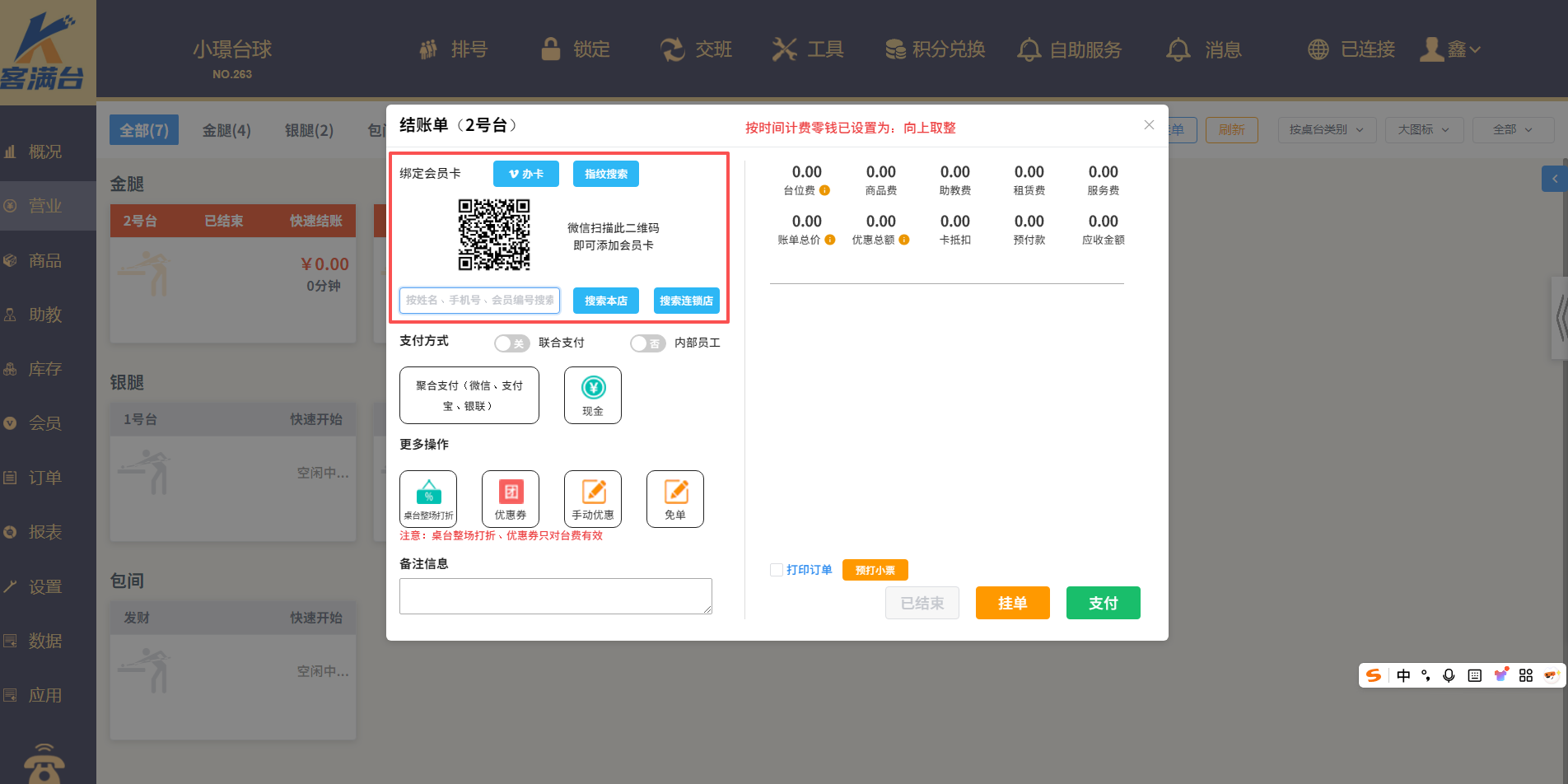 大部分球房都是结账挂会员卡,如果是大型商场,有多个门,避免客户逃单可以提前挂卡