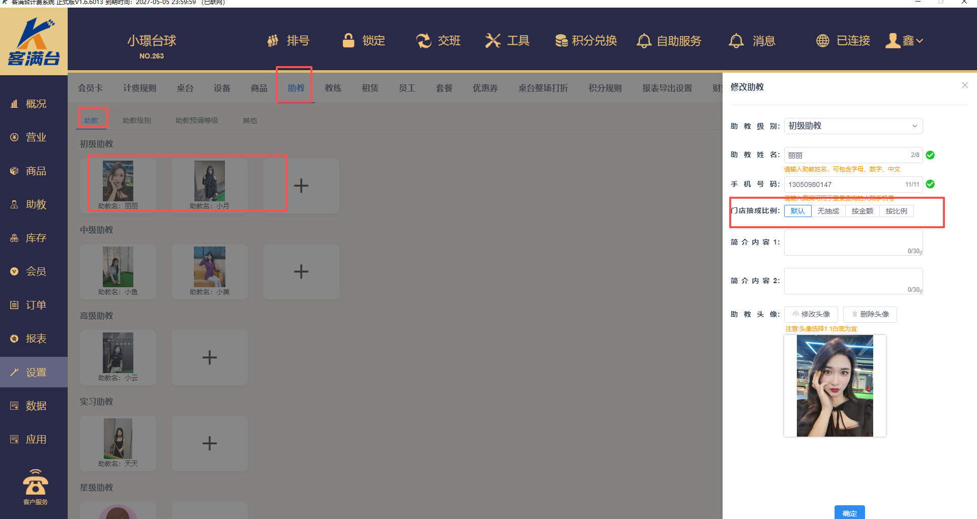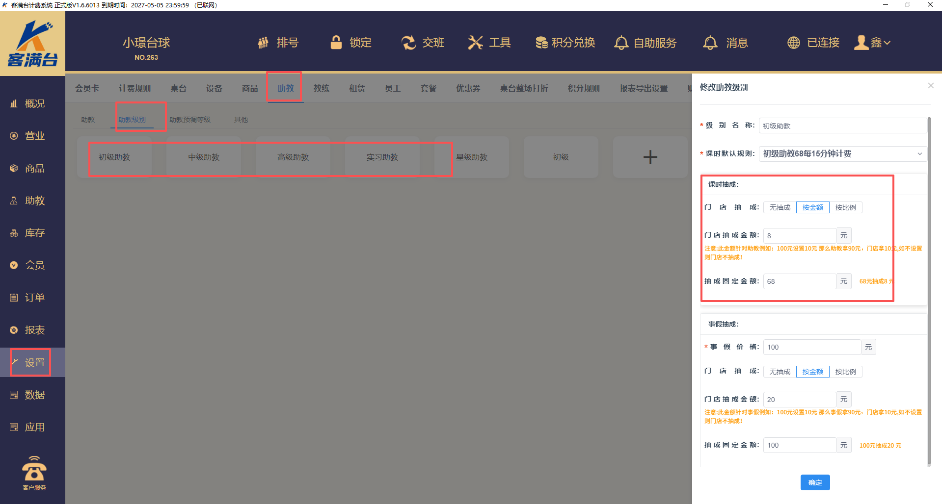 这一步,如果相同的级别,每个助教抽成金额都不一样,可以在助教信息里,单独设置助教的抽成。默认是在助教级别里设置的抽成