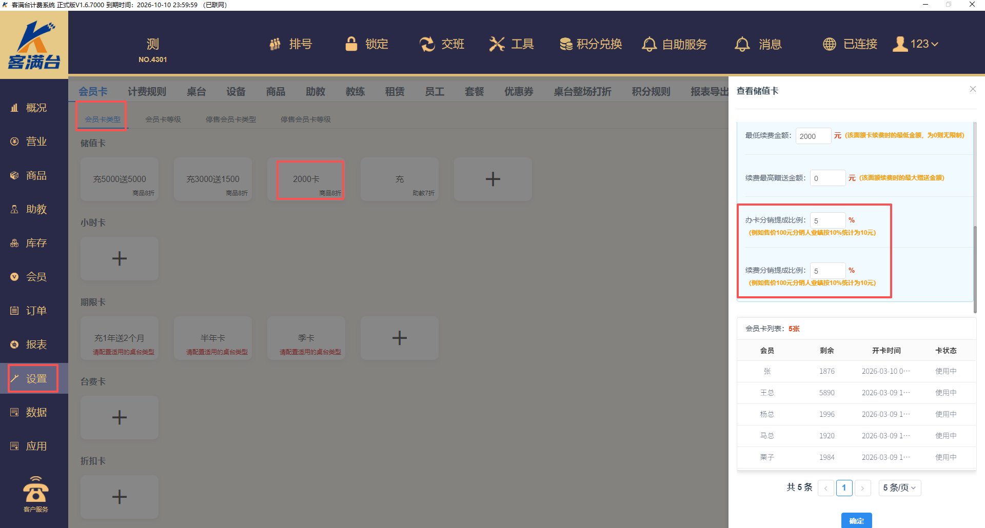 3、设置,会员卡,点击一个卡,往下划,可以设置办卡或者续费提成(注意不能设置小数)