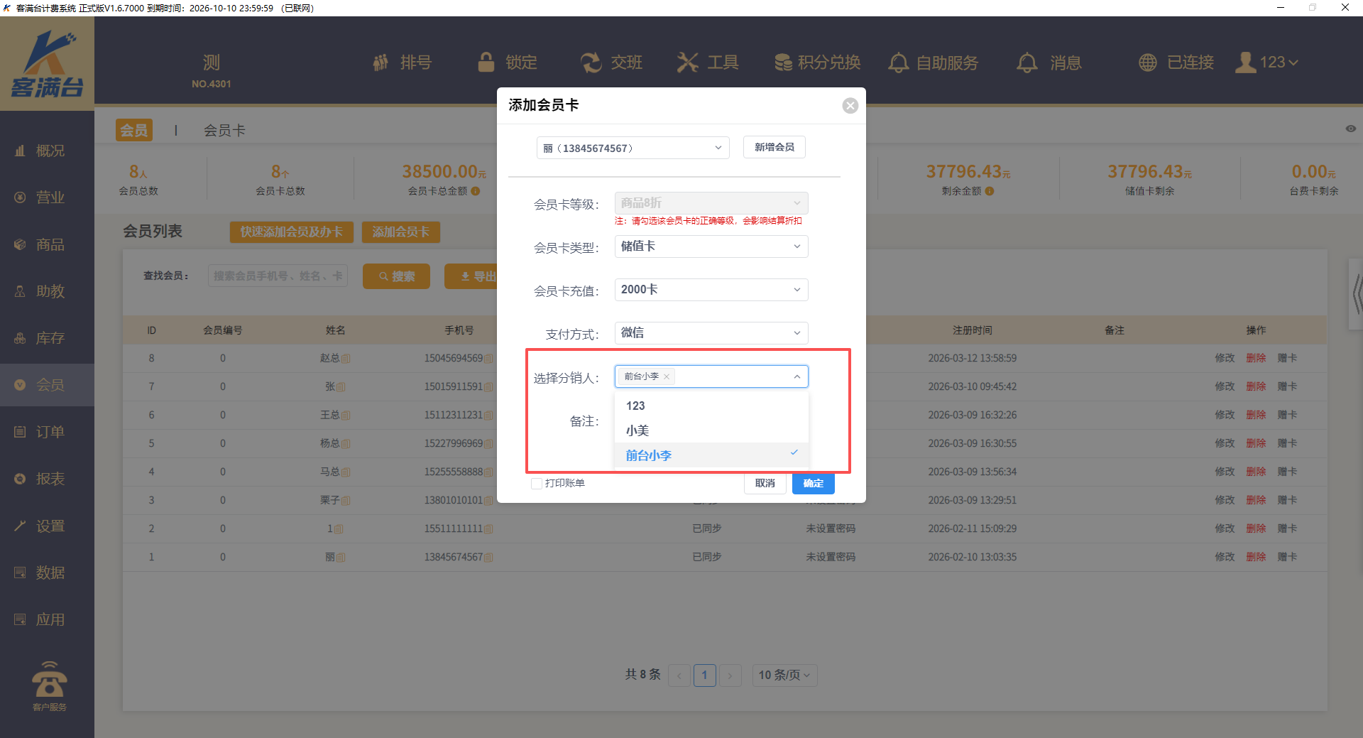 4、办会员卡时,可以选择分销人,然后点确定进行办卡