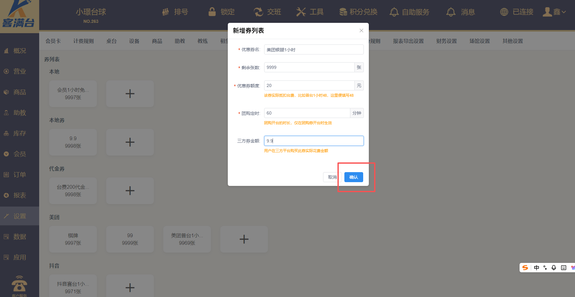 2、在对应分类下新增券,优惠券额度为原始台费金额,三方券金额为共管券设置的金额