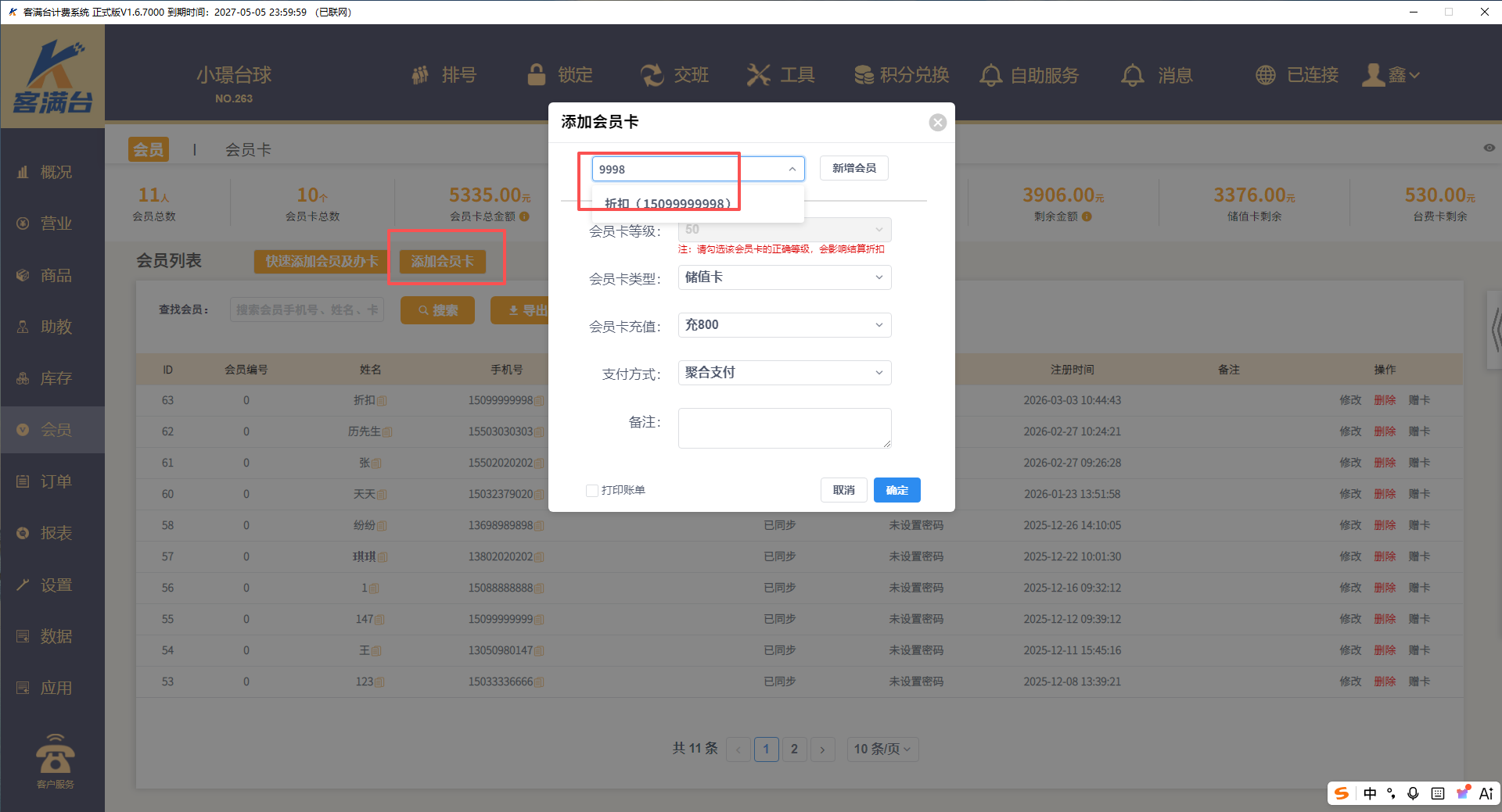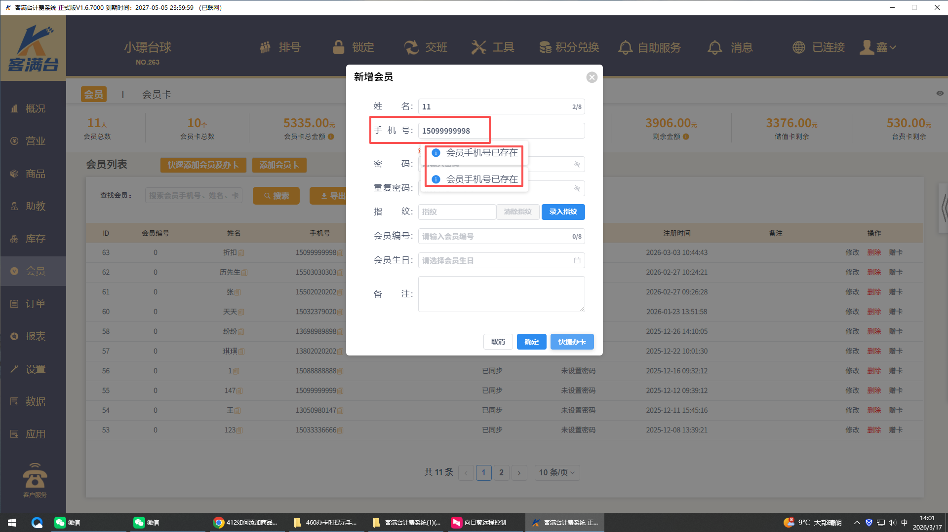 正常办理会员卡时,点击快捷办卡,提示手机号已存在,那是因为该会员已存在,之前办过卡或者添加过会员信息
